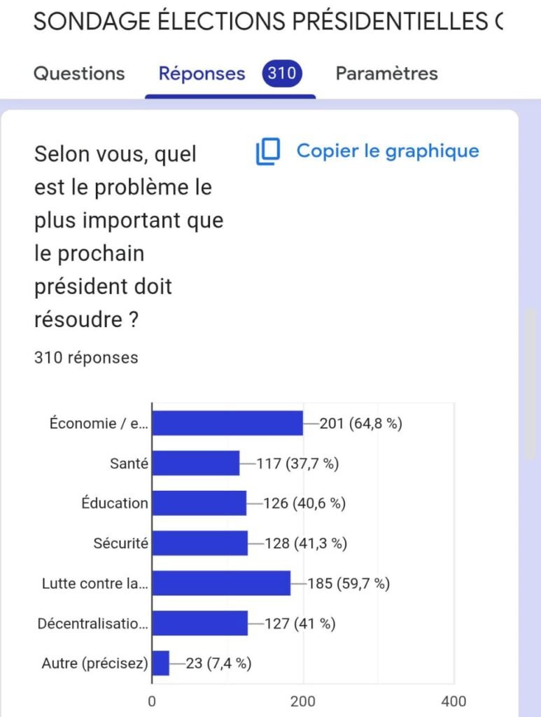 L’étude met également en lumière une forte mobilisation électorale, une prépondérance des jeunes votants, et des priorités claires axées sur l’économie, la santé, l’éducation et la lutte contre la corruption.