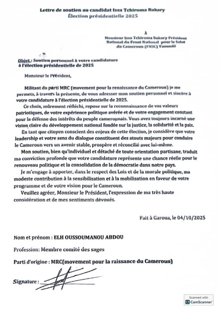Dans sa lettre adressée au candidat du FNSC, Elh Oussoumanou justifie son engagement par la reconnaissance des valeurs patriotiques, de l’expérience politique et du leadership rassembleur d’Issa Tchiroma Bakary. « Vous avez toujours incarné une vision claire du développement national fondée sur la justice, la solidarité et la paix », a-t-il écrit, saluant un homme politique constant dans la défense des intérêts du peuple camerounais.